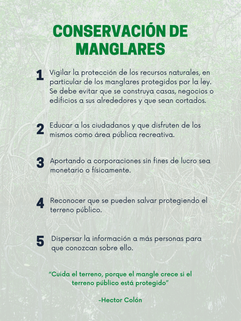 También, enfatizó que la extinción de los manglares en Puerto Rico causaría a su vez la extinción de diversas especies de cangrejos y peces. Lo que afectaría la pesca local.
