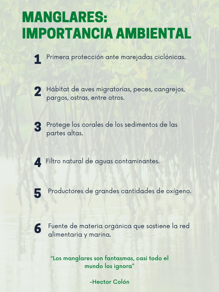 “Los manglares son fantasmas, casi todo el mundo los ignora”, indicó el ecólogo Héctor Colón. Estos bosques son reconocidos por ser un vivero de organismos marinos de las zonas costeras. Los manglares son también un refugio de vida silvestre.