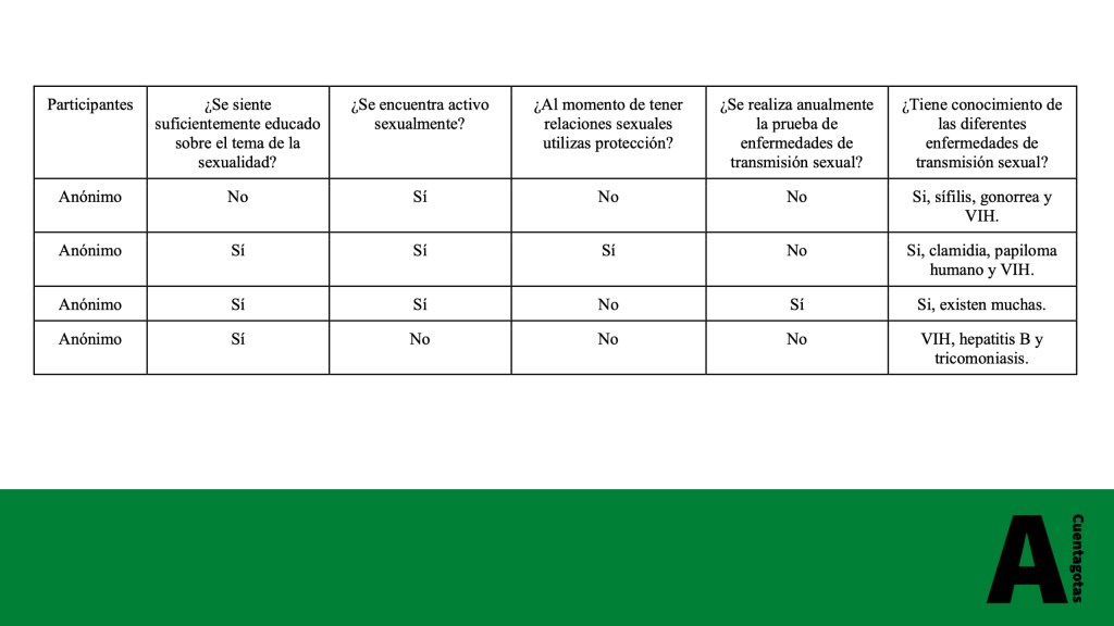 Delvin R. Baez Moyeno, Jorge L. Soto y Gregorio Torres confirmaron sentirse educados sobre el tema de la sexualidad. Torres indicó que la educación sobre el tema de la sexualidad debe comenzar en el hogar; Baez menciona que debe ser desde la escuela intermedia y Soto indicó que desde la niñez. Baez, Soto y Torres expresaron no realizarse la prueba de enfermedades de transmisión sexual anualmente. Delvin Baez dijo conocer algunas de las enfermedades de transmisión sexual que existen, las mencionadas por el joven fueron: clamidia, herpes, VIH y sífilis, mientras mencionó que el condón es el método de protección más común. Gregorio Torres expresó tener conocimiento sobre las diferentes enfermedades de transmisión sexual y las mencionadas por el mismo fueron VIH, clamidia, gonorrea, sífilis y hepatitis B. Como método de protección, Torres considera que el condón es el más efectivo. Jorge L. Soto indicó tener conocimiento sobre las enfermedades como el papiloma humano, sida, gonorrea y clamidia, como métodos de protección indicó conocer el condón y la abstinencia.