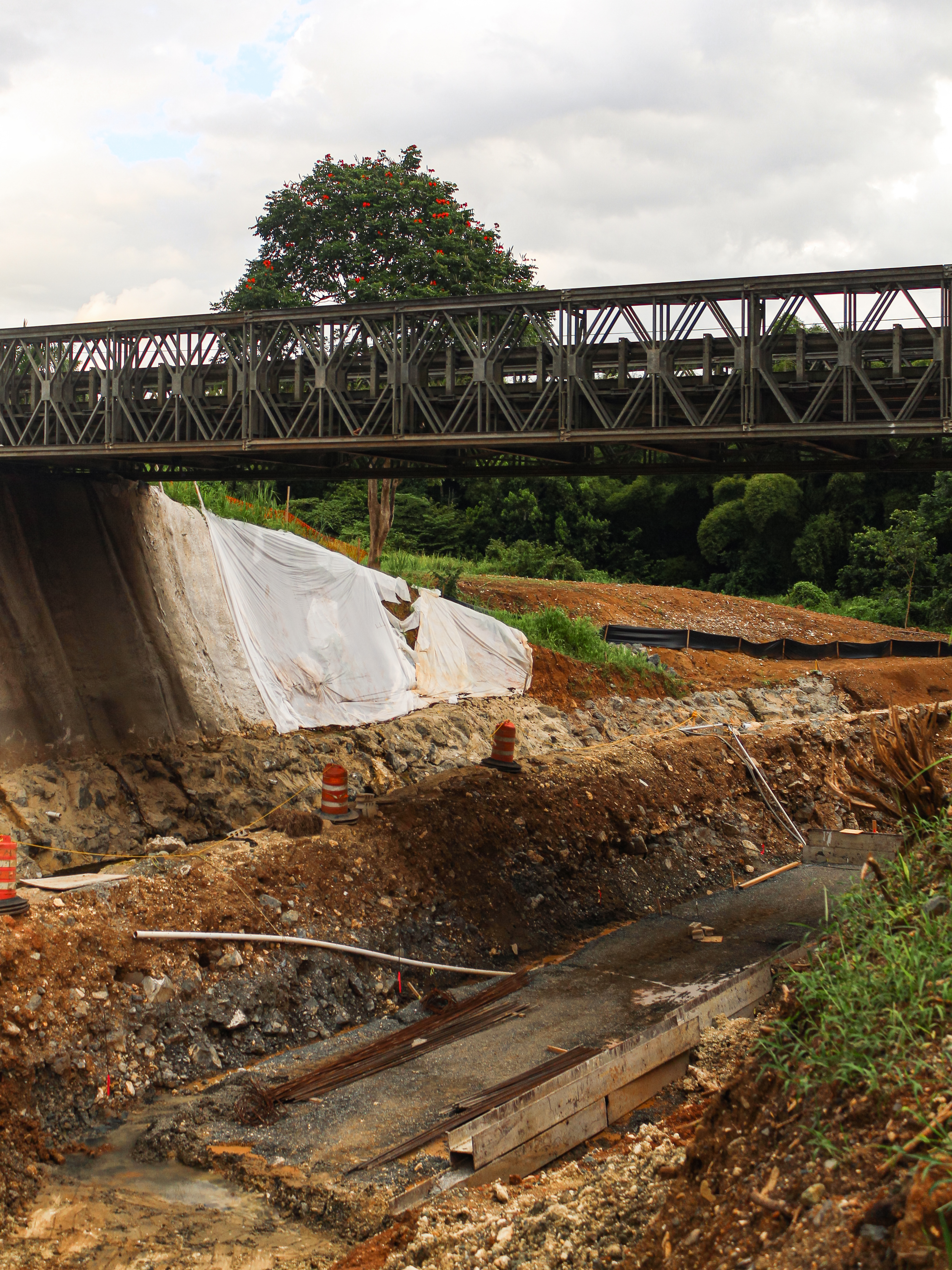 Arriba / Izquierda: En la primera imagen, el puente de Moca que colinda con el pueblo de San Sebastián se cayó por las altas lluvias del Huracán María. Durante unos meses se trabajó para colocar un puente provisional y más adelante construir uno que fuera permanente. A principios del 2020 se comenzaron a movilizar los procesos de construcción, pero se detuvieron a causa del Covid-19. No es hasta hace unos dos meses que se comenzó a laborar, y así como este hay otros alrededor de la isla.