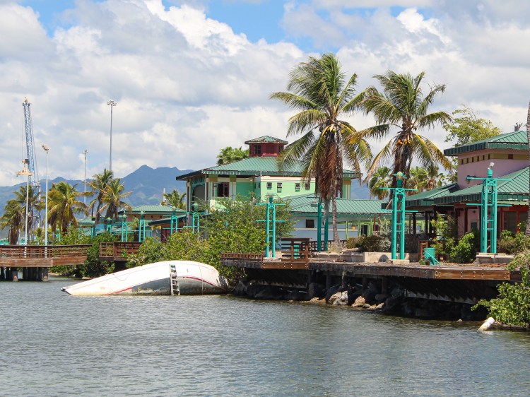 Arriba: Todo el complejo está abandonado y rodeado de rejas para mantener la seguridad del público. El área accesible que se sostiene está cerca de la torre, donde se encuentra el club de pescadores y una tienda de comida. Algunos de los negocios que fueron afectados, están ubicados de manera provisional en los alrededores del estacionamiento (El Nuevo Día, 2021). (En caso de no identificar las diferencias, puede ver este video de antes de los desastres, youtube.com).