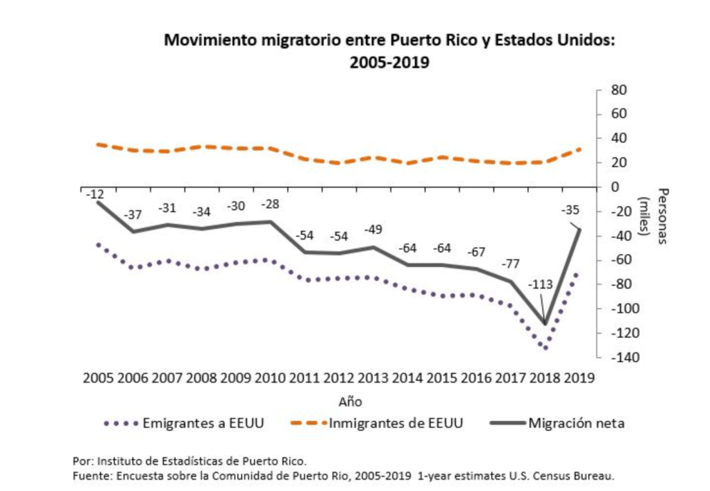 Según las estadísticas del Censo, el movimiento migratorio de los puertorriqueños a los Estados Unidos, desde el 2005, ha sido muy elevado. No obstante, en el 2019 hubo una reducción en la migración. Se estima que fueron 35 mil personas en ese año y en el 2017 fueron 97 mil puertorriqueños. A pesar de esta reducción, continúa siendo una cifra significativa para Puerto Rico.