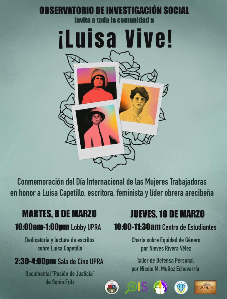 El martes ocho de marzo estuvieron desde las diez de la mañana hasta la una de la tarde en el lobby de UPRA con una dedicatoria a Capetillo, además, leyeron algunos de sus escritos. Ellos decidieron conmemorarla de una manera diferente, Valerie Tirado, quien es parte del OIS, comentó que “hoy todos solos Luisa”. Luego, a las 2:30 P.M., se estuvo presentando el documental Pasión de la Justicia sobre la vida de Luisa Capetillo en la sala de conferencia de la Universidad.