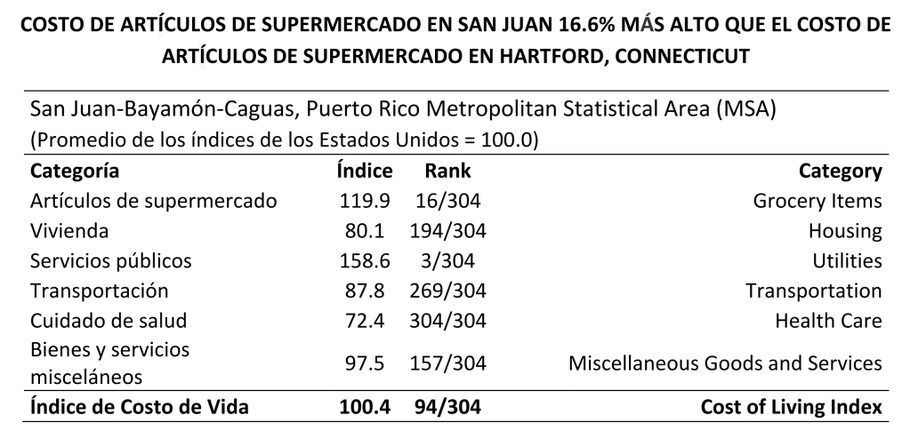 El Instituto de Estadísticas de Puerto Rico indica que en el tercer trimestre que componen los meses de entre julio y septiembre del año 2022 el índice del costo de vida en la isla se fijó en «100.4». La zona metropolitana de San Juan se sitúa en la posición número 94 entre las 304 jurisdicciones comparables de los Estados Unidos.