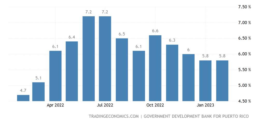 Según las estadísticas más recientes del Banco de Desarrollo Económico para Puerto Rico la tasa de inflación hasta febrero del 2023 se sitúa en un 5.80%; para febrero del 2022 esta calculaba un 4.70%.