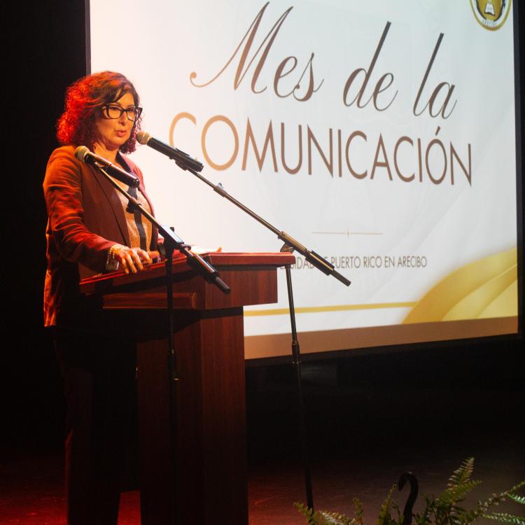 La Dra. Mildred Vélez hablando sobre la trayectoria y la importancia de Luciano en el Departamento de Comunicación Tele-Radial del recinto arecibeño. (Foto por: Jan Román Millán | @AFEV.UPRA)