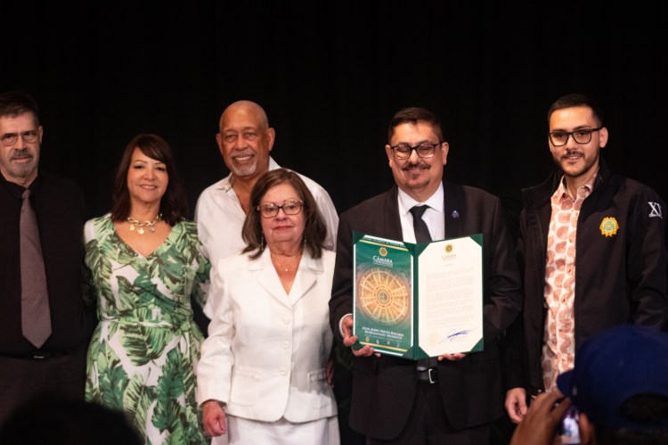 Representante de la Cámara del Senado hizo entrega de un reconocimiento al profesor homenajeado en el marco del Mes de las Comunicaciones. (Foto por: Migjoalis Montañez | @AFEV.UPRA)
